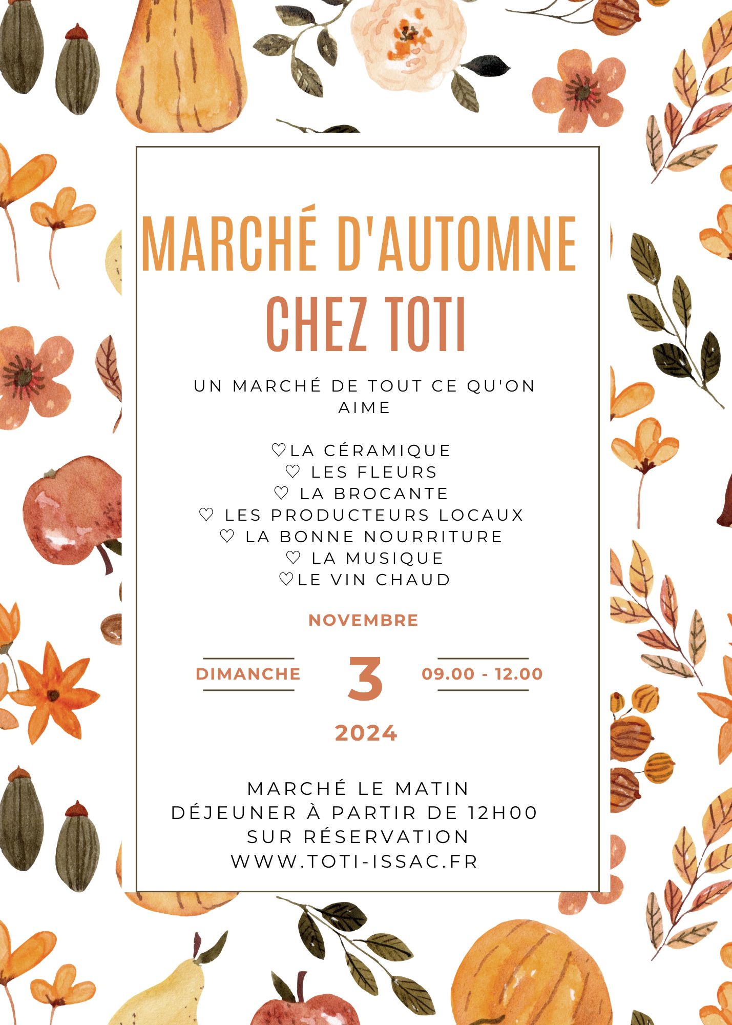 Nous organisons notre deuxième marché d’automne chez Toti. C’est un petit marché où l’on trouve tout ce que l’on aime. Il est ouvert de 10h à 16h environ, et le déjeuner est proposé à partir de midi. Pensez à réserver !